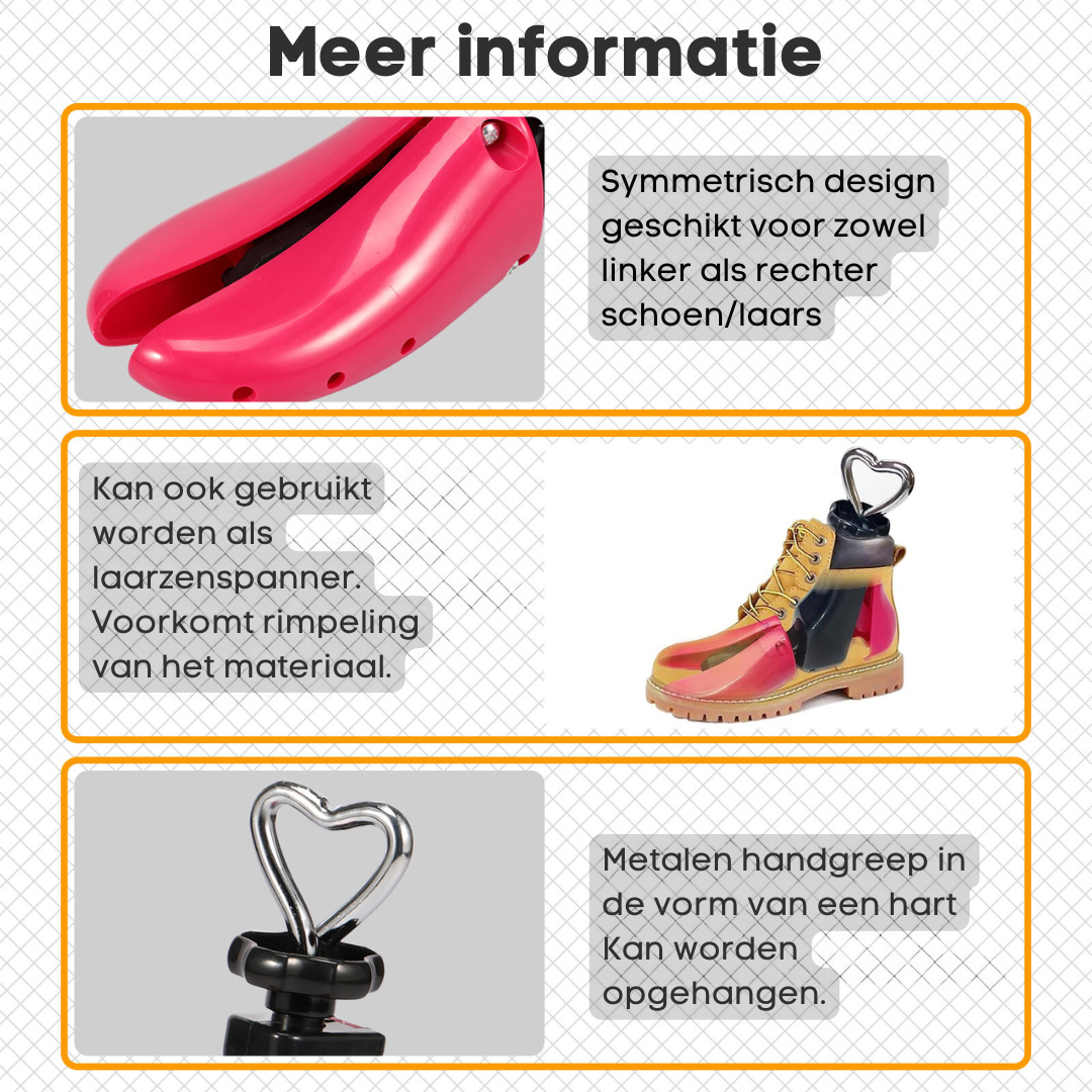 Met de ShoeStretcher is dat verleden tijd. Onze laarzenspanner is van sterk materiaal en kan worden aangepast in breedte en lengte. Zo zitten je laarzen precies goed en comfortabel. Deze spanner is stevig, makkelijk te gebruiken en werkt voor verschillende soorten laarzen.
