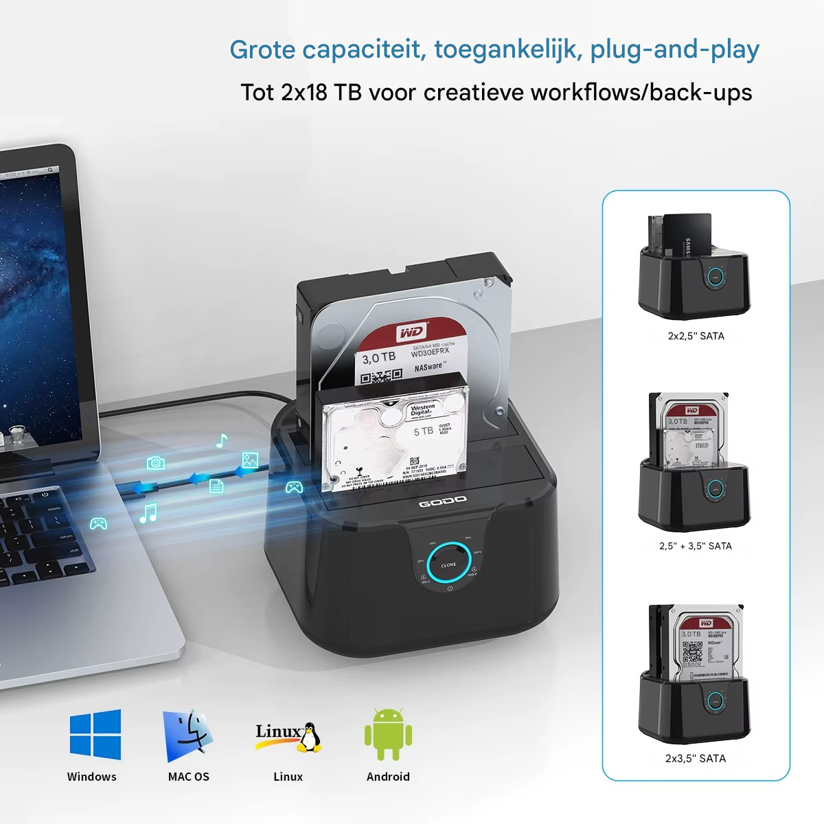 TotalRecovery Dock™ neemt alle stress weg. Geen schroeven, geen kabels zoeken, geen technische uitleg. Je klikt de schijf erin, sluit hem aan, en in drie seconden staat alles op je scherm. One-Touch Backup kopieert complete mappen met één druk op de knop, zodat je nooit meer bang hoeft te zijn om belangrijke bestanden kwijt te raken. Je hoeft niemand meer om hulp te vragen — je doet alles zelf, snel en veilig.